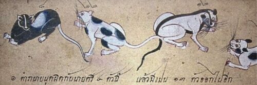 Opera storica di origine Thai, raffigurante alcuni pattern curiosi di gatti affetti da piebaldismo. Tratto da MessyBeast